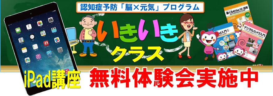 iPad講座「いきいきクラス」とは、少人数制のグループレッスンで、iPadの利活用を学ぶだけでなく、体操やウォーキング等の有酸素運動の習慣化やバランスンスのとれた食事による認知症予防を指導する高齢者に限定の基礎コースです。 |